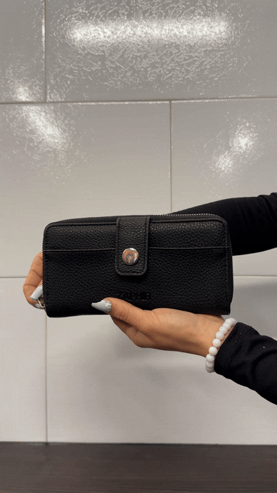 - Interior con múltiples compartimientos para tarjetas, billetes y monedas.
