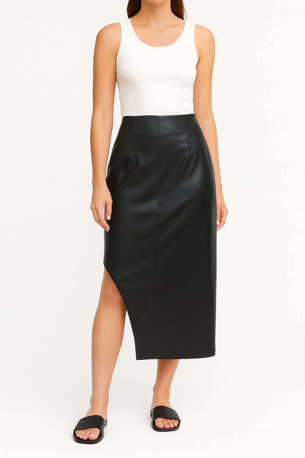 Pollera larga engomada, con diseño asimétrico súper moderno. La cintura con pinzas estiliza la figura, y el cierre lateral permite un calce cómodo y firme. Un modelo elegante, sexy y perfecto para looks urbanos o de noche. 🖤