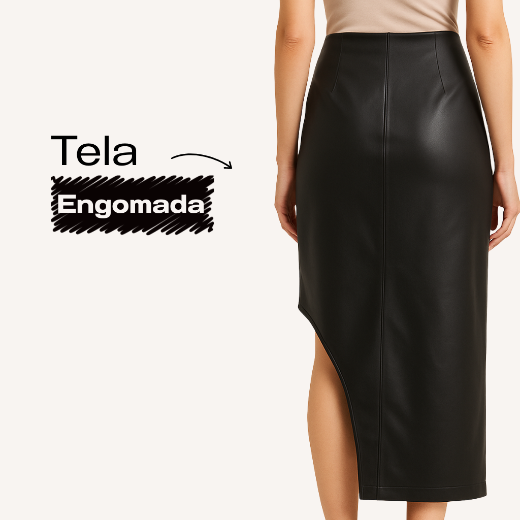 Su corte asimétrico crea una silueta estilizada y moderna. La tela engomada aporta estructura, brillo suave y un look de alto impacto. Ideal para usar con sandalias, botas o tacos, según la ocasión.